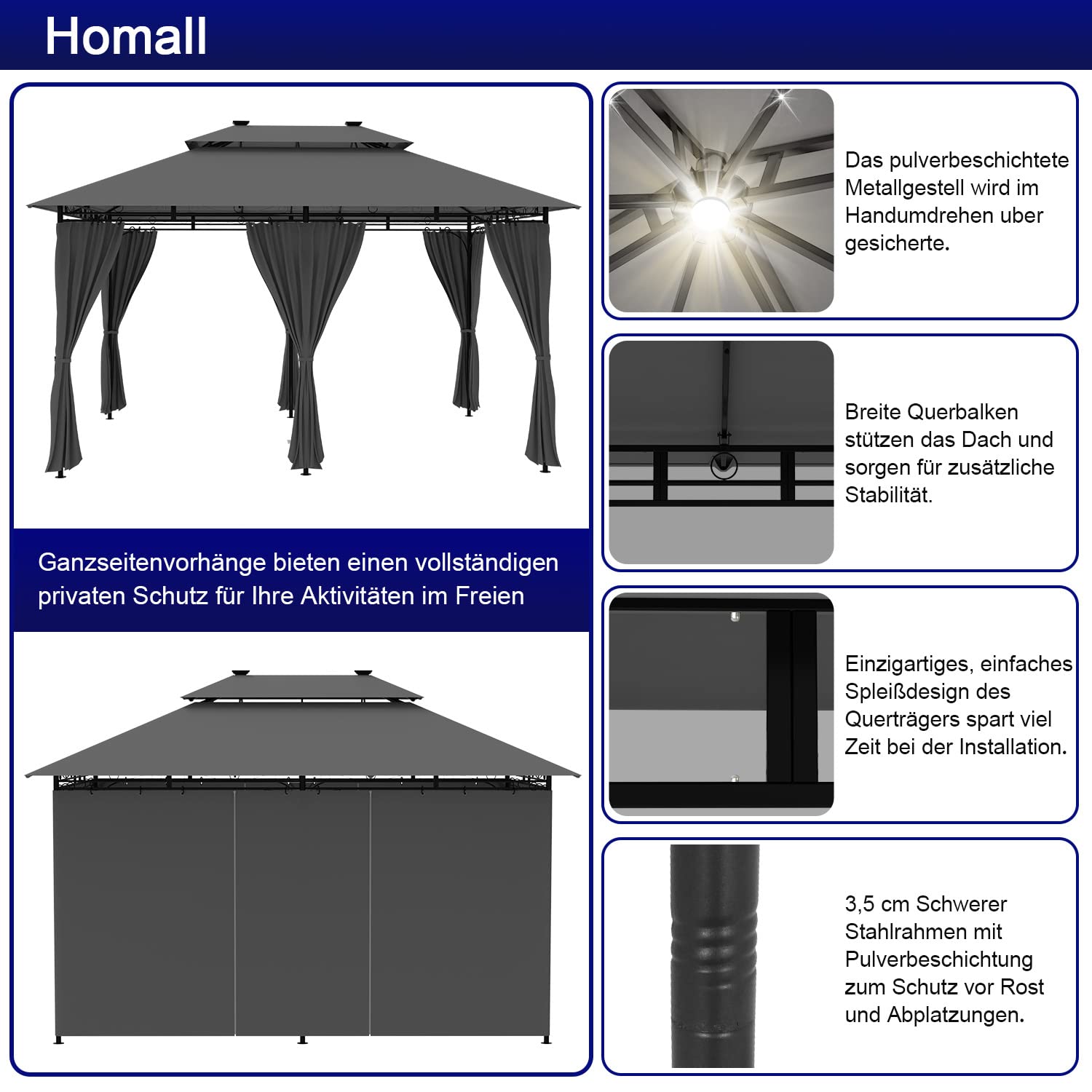 - 5 Jahre Garantie: Alle Teile des Outdoor-Pavillons werden mit einem Etikett mit Teilenummer und Schritt-für-Schritt-Anleitung geliefert. Wenn Sie Probleme wie fehlende Teile oder beschädigte Produkte haben, zögern Sie nicht, uns zu kontaktieren. Wir beraten Sie professionell und bieten Ihnen den besten Einkauf.